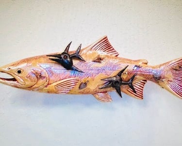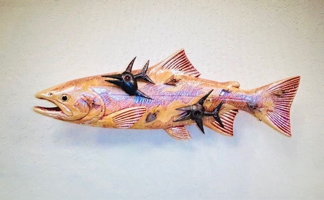The surfaces and glazes of the individual fish I make are patterned after the reflected color of the water and the texture of the rock formations along the river where I guide. With the application of ceramic glazes, each fish becomes my own personal abstract painting.My artwork has provided a clarity and direction for me. It's been a way ofexploring why people hunt and fish and what constitutes the outdoor experience. As an artist, I feel very fortunate for the generous gestures from friends and clients that have made possible my pursuit of a very personal vision. Through my fishing, I have made many friends and allies who share my passions and concerns about the natural world. This body of work focuses on the Hybridization of the Natural World. The path Science seeks to make the natural worlds animals and plants, Somehow, more efficient. A process, obviously, I don’t believe in!