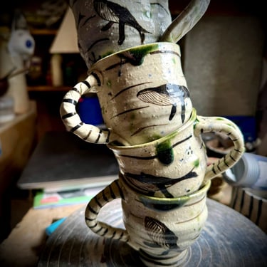 I draw significant inspiration from Japanese ceramics, particularly the Oribe style, which is known for its avant-garde, deformed vessels and bold abstract patterns. My work is also influenced by the Japanese philosophy of Wabi-Sabi which celebrates the beauty of imperfection and transience. I hand-mix my own clay and glazes, often using ash and materials from the Ruapehu region. Ceramics from my kilns are used in everyday life and in collections worldwide.