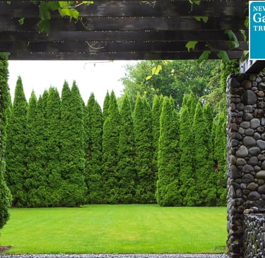 It is bordered by a stream across which several large purple and green beech trees can be seen. These trees appear to be from a vintage that is similar to the