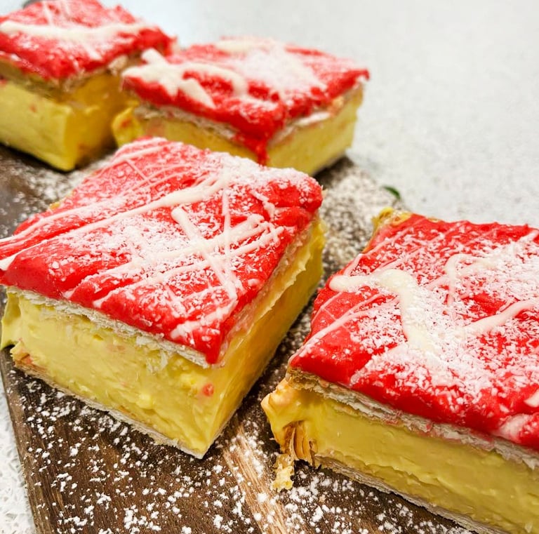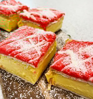 Indulge in a slice of our freshly baked cake, perfect for dessert.